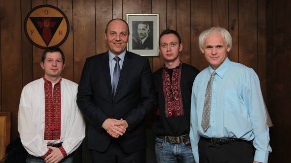 La numerosa diáspora ucraniana en Norteamérica vuelve a ser decisiva en las andanzas de Parubiy por Norteamérica. Su viaje canadiense, por ejemplo, es organizado por el Consejo Ucraniano Canadiense (Ukrainian Canadian Congress). Una delegación de la UCC es la que se encarga de recogerle a su llegada el día 21 de febrero al aeropuerto de Toronto. Esa misma noche participa en una reunión extendida del Consejo Asesor de la UCC para debatir la situación actual en Ucrania.