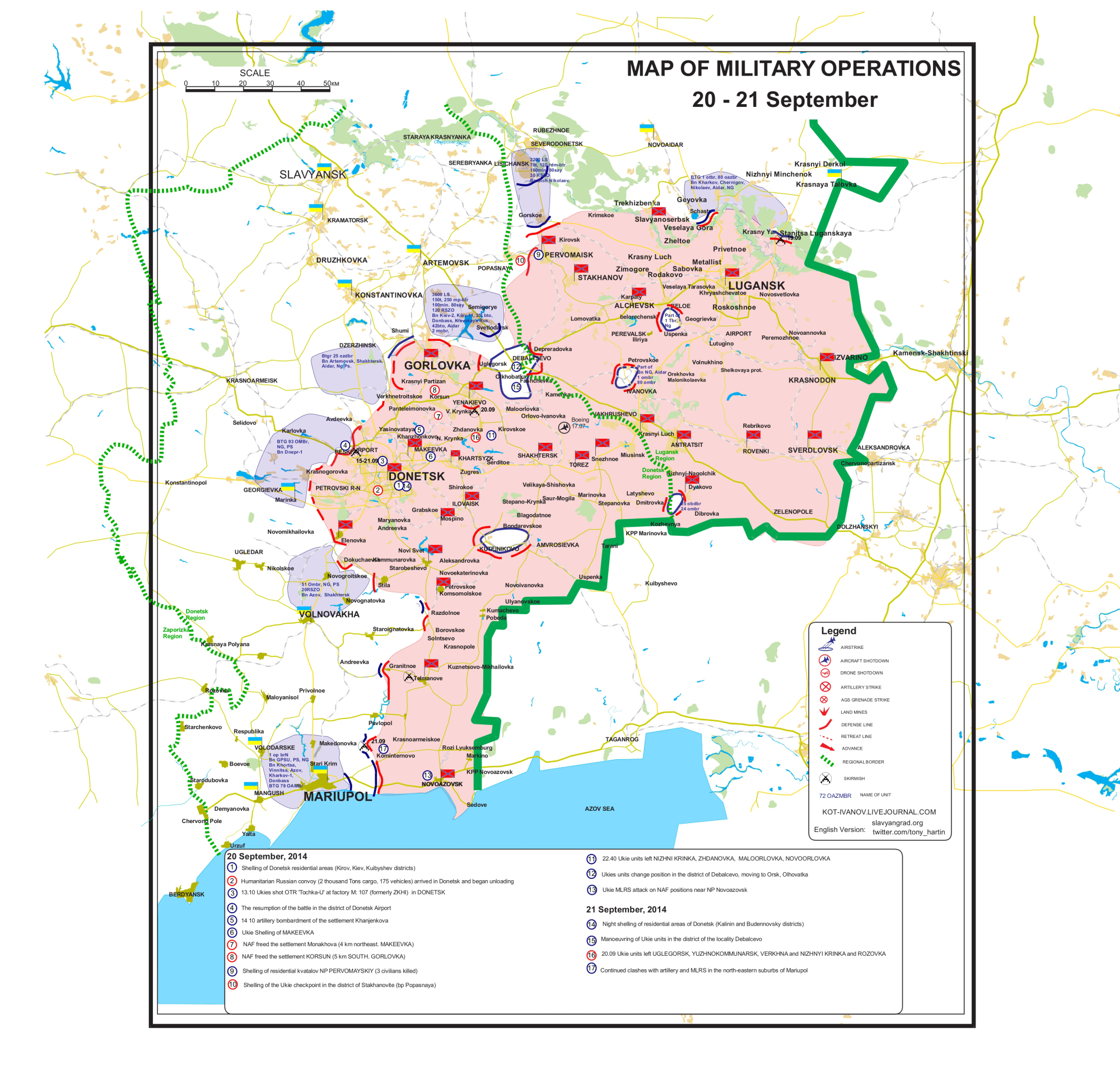 El enemigo ha abandonado una serie de asentamientos en la República Popular de Donetsk, pero los ataques y atrocidades continuarán. Las tropas de la junta se han estado reagrupando y fortificando las posiciones que ocupan actualmente. El 20 de septiembre, una aeronave de las Fuerzas del Aire ucranianas y un avión no tripulado realizaron vuelos de reconocimiento sobre las zonas de Zhdanovka y los barrios occidentales de Donetsk.