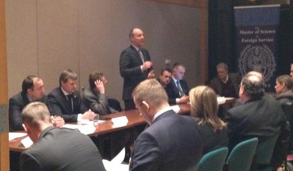 La primera intervención pública de Parubiy, junto a otros representantes del actual Estado ucraniano, algunos de ellos vinculados a su Ministerio de Defensa, se produce en la mesa redonda “Defendiendo la democracia en Ucrania”. Esta intervención se enmarca dentro del programa del Master of Science in Foreign Service de la Universidad de Georgetown, sesión que coordina Philip. A. Karber.