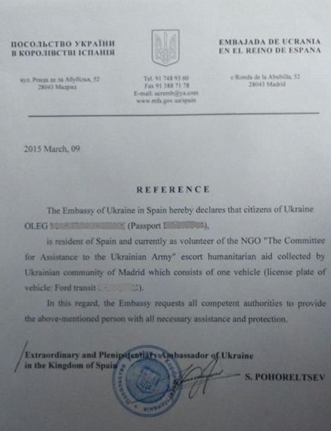 El propio embajador Pohoreltsev firma una carta, publicada en una página de Facebook de la diáspora, en la que se señala que un ciudadano de Ucrania, voluntario del Comité para la Asistencia al Ejército y miembro de Svoboda, según nota posterior de ese partido, escoltará la ayuda recogida por la comunidad ucraniana de Madrid. El escrito solicita en inglés la asistencia y protección a esa persona por parte de todas las autoridades competentes.