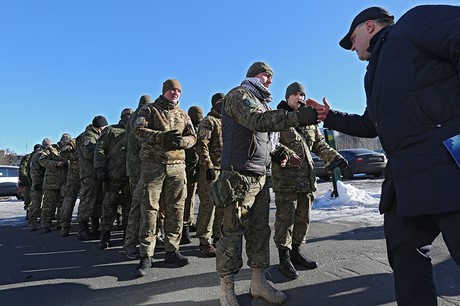 El líder de Svoboda, Oleh Tyahnibok, saluda a los miembros del batallón Sich antes de salir para el frente