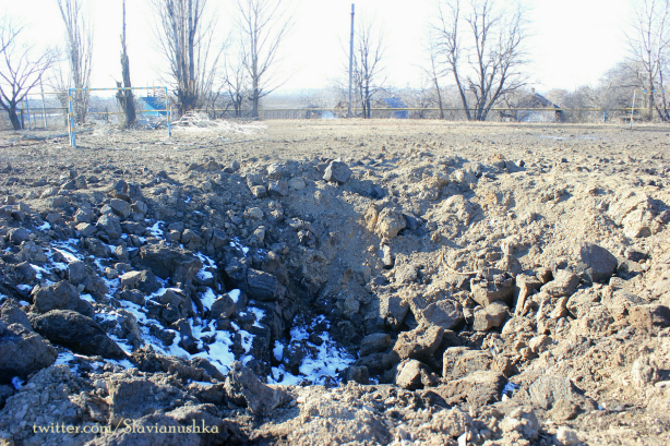 El comandante en funciones de la Oficina del Comando de Perevalsk me guió en una breve visita por una de las pequeñas localidades más cercanas a la línea del frente. Las tropas ucranianas habían continuado disparando contra zonas residenciales del pueblo hasta el mismo momento en que la milicia barrió Debaltsevo de fuerzas ucranianas. Tomamos una carretera que conozco perfectamente. Atravesamos una zona del pueblo en la que por todas partes se podían ver las consecuencias de los bombardeos. Nos aproximamos al colegio por la parte trasera, donde vimos un campo de fútbol con un gran cráter en la parte central. Después vimos otro cráter, consecuencia de un misil Uragan, junto al colegio.