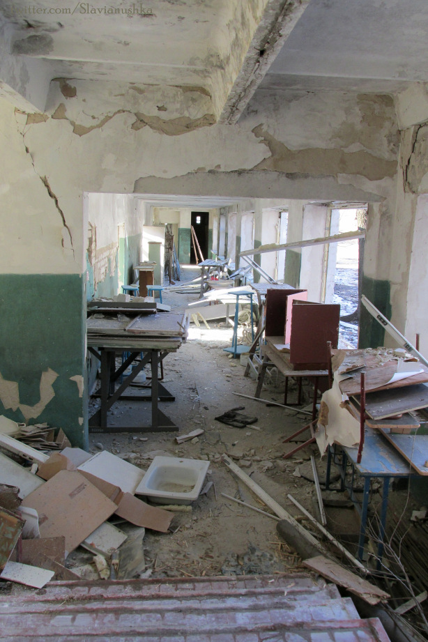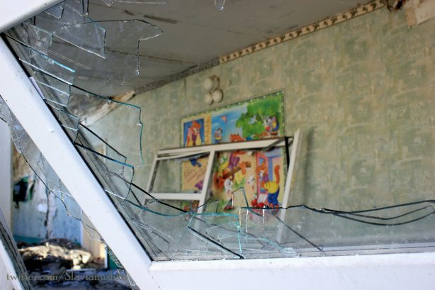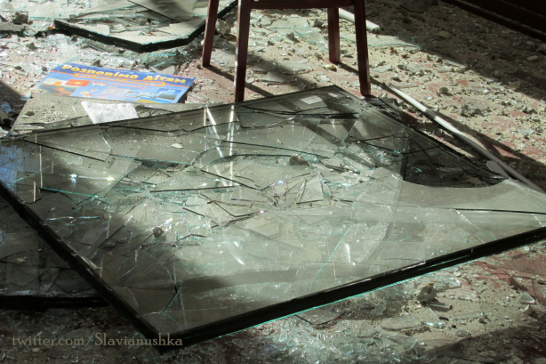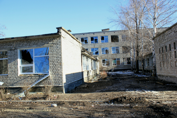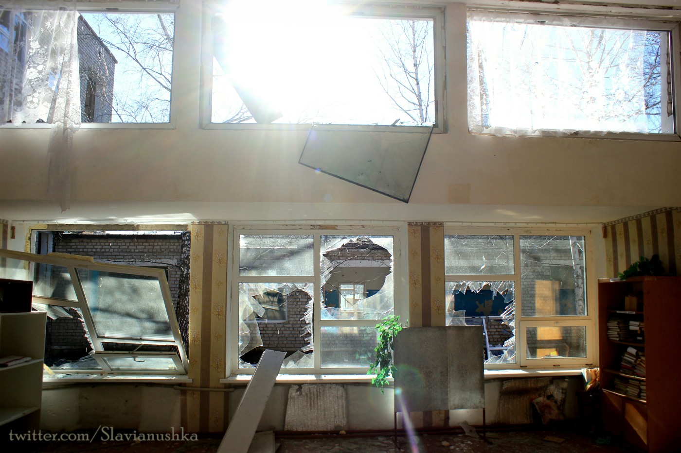 No ha quedado una sola ventana intacta en el lado del colegio orientado hacia Debaltsevo. Evidentemente, no se trataba de disparos al azar: se observaba que todos los disparos hacia el colegio habían sido impactos directos.
