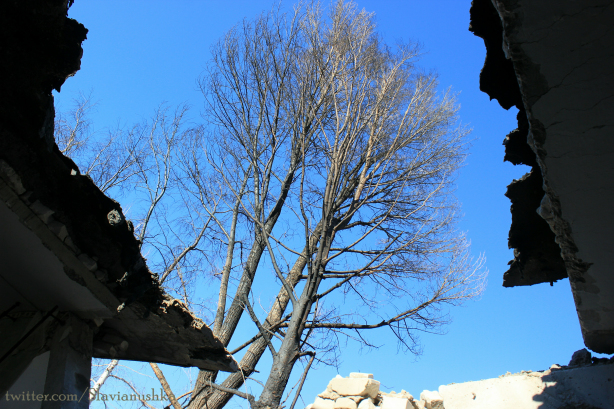 Caminamos alrededor del colegio. Su fachada, orientada en dirección al territorio controlado por la milicia, se ha mantenido prácticamente intacta. Curiosamente, este colegio era uno de los más bonitos de la región de Perevalsk: hace dos años había recibido una subvención para renovar la fachada, por lo que había quedado completamente renovada.