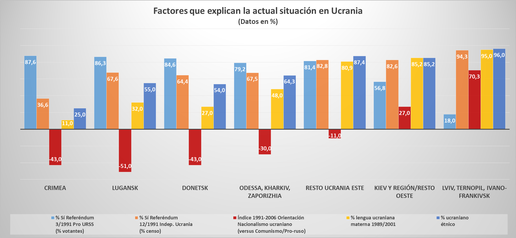 Como muestra el gráfico, únicamente en una parte de Ucrania occidental, en la zona compuesta por las regiones de Lviv, Ternopil e Ivano-Frankivsk, resulta claramente dominante el posicionamiento nacionalista ucraniano, con un índice de identificación de +70,3 puntos. Aunque orientado hacia el mismo polo nacionalista, la región de Kiev y el resto de las zonas occidentales de Ucrania se sitúan muy lejos de ese grado de identificación, con +27 puntos en el índice pro-nacionalista. El resto de las regiones de Ucrania se orientan en cambio hacia el polo no nacionalista ucraniano. Esta realidad es la que explica que hasta 2014 dominara el panorama político de Ucrania el Partido de las Regiones.
