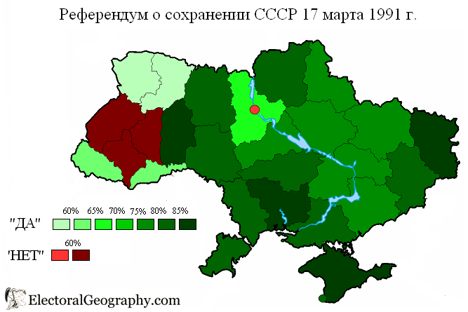 Mapa regional de los resultados del referéndum de marzo de 1991 respecto a la continuidad de la URSS en la que destaca la excepcionalidad en Ucrania de la posición de las regiones de Lviv, Ternopil e Ivano-Frankivsk