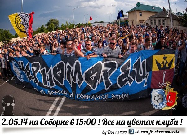 De nuestros suscriptores y de residentes preocupados de Odessa ha surgido la idea de pedir a los ultras del Chernomorets [club de fútbol de Odessa], junto a los ultras del Metalist [equipo de Kharkov], que el día del partido entre los equipos (este viernes, 2 de mayo), marchen por la unidad de Ucrania en nuestra ciudad, marcha que sería capaz de llegar a todos los habitantes de Odessa! Si estás de acuerdo, por favor, reenvía!!!