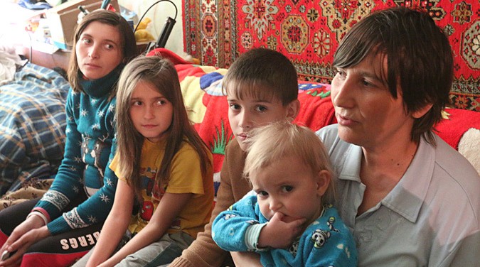 Tiene todas las características de un gueto de libro. Pese a ser de día, deambula gente bajo los efectos de la droga, o tirados en el asfalto. El ascensor ya estaba destruido antes de la guerra y el hueco se usa ahora como vertedero. El pequeño apartamento de dos habitaciones está cubierto por capas de ropa y cada centímetro libre se usa para dormir. Hay yeso en lugar de papel pintado, pero el lugar está limpio. En la oscuridad de una sala grande, una televisión muestra imágenes rojas y negras. Pasamos junto a una bolsa de fruta –naranjas, mandarinas- 11 de cada. Encontramos una esquina en la que sentarnos. La madre, Maya Zaratuychenko, nombra los niños y habla sobre una familia, la suya, difícil de comprender. Por edad, son prácticamente tres generaciones: David tiene un año y 10 meses; Bogdan, 12; Lera, 10; Kate, 2; Diana, 7; Christina, 20; Vick, 15; Yaroslav, 16; Nastia, 4; Alina, 3; Sofía, 1. Algunos de los niños están ahora en el hospital para un chequeo médico. Nos hablan de la guerra: