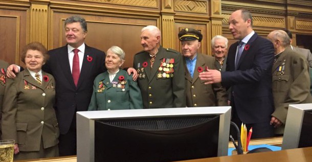 “Bisabuelos y biznietos deben estar unos junto a otros, demostrando la unidad de sus puntos de vista y los absolutamente obvios paralelismos: contra quién luchó el pueblo ucraniano entonces y contra quién lucha ahora”, decía el comunicado. Según el presidente, el pueblo de Ucrania realizó una contribución incalculable a la victoria sobre el nazismo entre 1939-1945 con su heroísmo en la lucha por la liberación de Europa, algo que continúa en la actualidad. “Hoy, Ucrania y los ucranianos son la frontera exterior de la civilización europea en la lucha por la libertad, la democracia y los valores europeos”, insistió el presidente. Los héroes de ayer son los héroes de hoy, aunque se ponga al mismo nivel a pilotos de la Segunda Guerra Mundial y Nadia Savchenko, detenida en Rusia acusada de participar en la muerte de dos periodistas rusos y cuya huelga de hambre no ha dejado de utilizarse como arma política.
