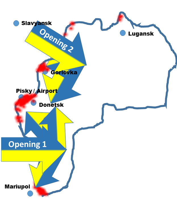 En este momento, la estrategia más previsible parece ser un “pellizco” entre Donetsk y Mariupol apoyado por otro al norte de Donetsk. Sin capacidad para realizar dos de estas operaciones a la vez, es de suponer que el principal objetivo será aislar las posiciones de la milicia en la zona de Mariupol. El “pellizco” hacia Donetsk será, presumiblemente, una distracción y una operación táctica para prevenir que la milicia pueda enviar refuerzos a las fuerzas atacadas en la zona de Mariupol. Una vez que se produzca el éxito de esta primera fase (que dejaría aisladas y rodeadas a las fuerzas de la milicia), se podría activar el segundo objetivo de rodear Donetsk y su estratégico aeropuerto.