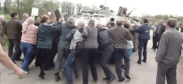 Aunque sorprenda, el entrevistador no pide a Yuschenko la fuente de su información, como tampoco se le exige explicar cómo el Gobierno ucraniano ha podido contabilizar el número de tanques rusos en suelo ucraniano. Porque es la visión de la épica lucha de los voluntarios ucranianos contra la agresión extranjera la que debería ser problemática para cualquier periodista con un mínimo conocimiento de los hechos. En su discurso, Yushchenko olvida que esos voluntarios no tienen escrúpulo alguno en disparar contra los que, hasta ayer, eran sus compatriotas. Al contrario de un ejército regular que no se negó a luchar contra el ejército ruso sino a disparar a la población civil, desarmada, que se colocaba frente a los blindados en Slavyansk hace ya más de un año.