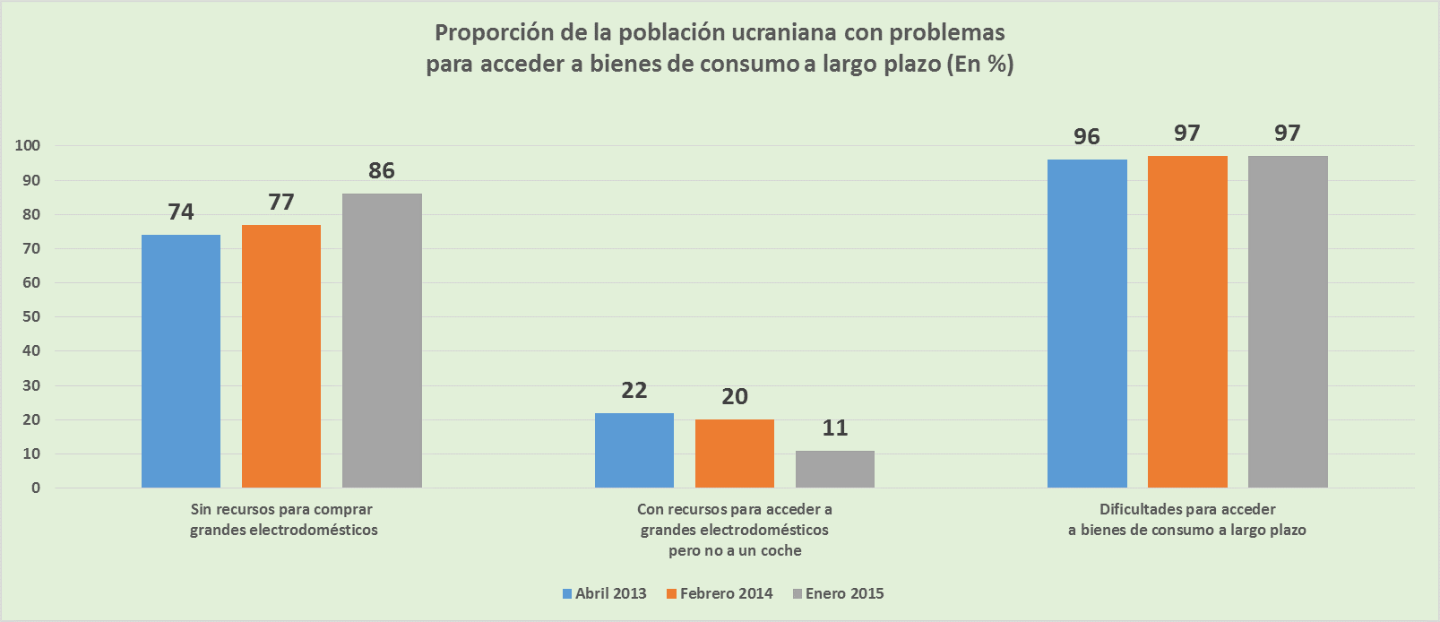 El seguimiento del barómetro de TNS Global sobre la situación social en Ucrania aporta información más concreta sobre los aspectos señalados. En lo relativo a la incapacidad de ese Estado por garantizar un mínimo de bienestar a su población tras la caída de la Unión Soviética, llama la atención que entre un 96 y un 97% de la población carece todavía en la actualidad de la posibilidad de acceder a bienes que conforman el marco de bienestar de los países occidentales, ya se trate del acceso a un coche o a los grandes electrodomésticos habituales en los hogares de esos países.