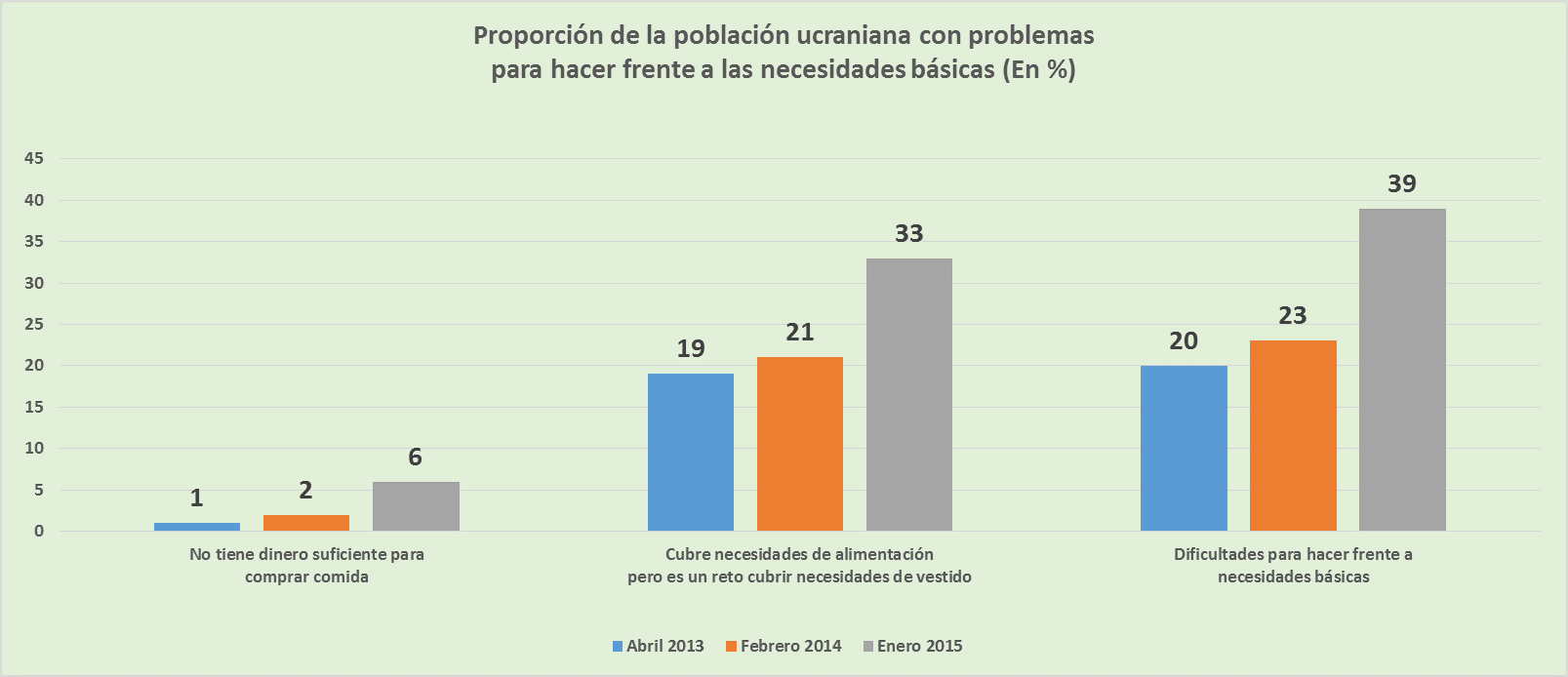 Sin embargo, el principal problema social del país tiene un componente mucho más grave, con un notable incremento de los indicadores asociados a la pobreza, incluidos los que reflejan el impacto de sus formas más extremas. El dato más llamativo es que, entre febrero de 2014, en pleno apogeo del levantamiento nacionalista en Ucrania, y enero de 2015 aumenta en 16 puntos el porcentaje de población con dificultades para cubrir las necesidades básicas. En abril de 2013, un 20% de los habitantes de Ucrania señalaba algún problema para hacer frente a las necesidades de vestido y alimentación, proporción que apenas había subido al 23% en febrero de 2014. A primeros de 2015, sin embargo, el porcentaje de referencia había llegado al 39%. En esa fecha, por tanto, casi cuatro de cada diez ucranianos tenían problemas muy graves relacionados con la cobertura de las necesidades básicas.