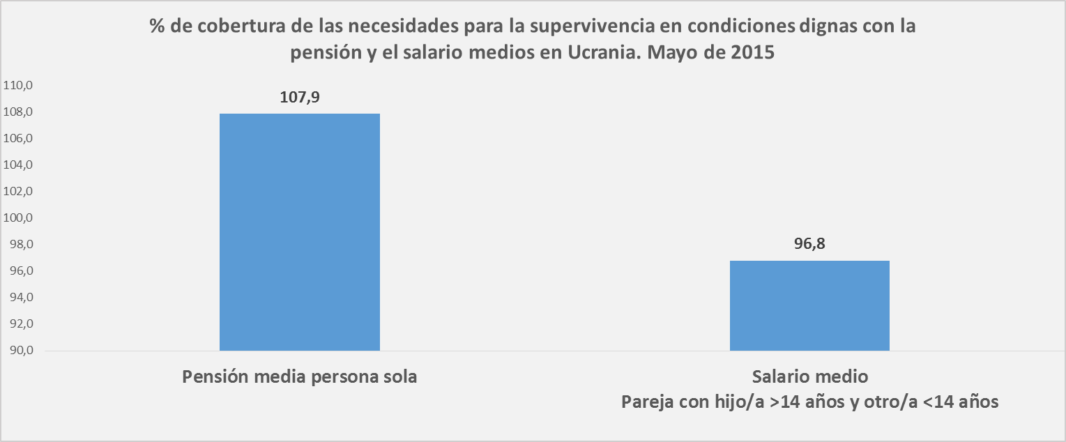 Las implicaciones del deterioro observado son llamativas. Como muestra el siguiente gráfico, la pensión media en Ucrania se acerca al límite de cobertura de la supervivencia, situándose en mayo de 2015 apenas un 7,9% por encima del umbral de supervivencia. El salario medio sólo resulta funcional, por su parte, para unidades familiares de muy pequeño tamaño. En el caso de una familia compuesta por una pareja con dos hijos/as, uno de ellos mayor de 14 años, la garantía de supervivencia en condiciones dignas se queda ya un 3,4% por debajo del umbral de supervivencia.