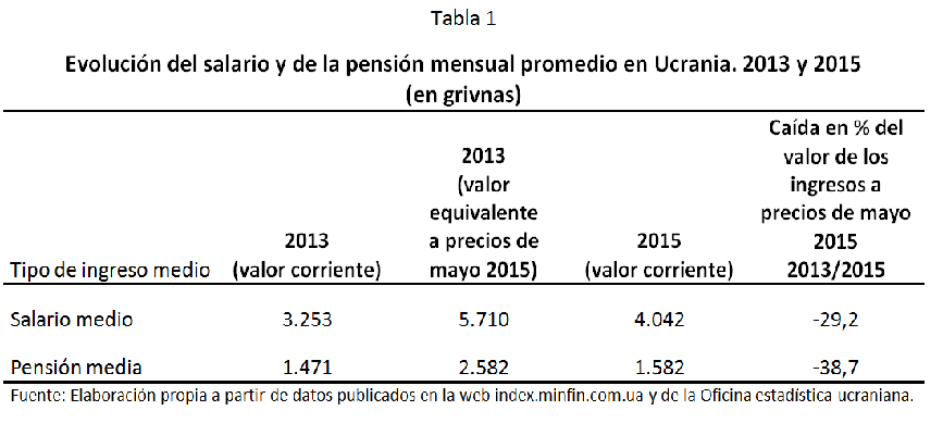 En mayo de 2013, nueve meses antes de la caída del gobierno del Partido de las Regiones, el salario mensual promedio en Ucrania era de 3.253 grivnas. Dos años después, el último dato disponible sitúa dicho salario medio en 4.042 grivnas. Para poder comparar las dos cifras, sin embargo, es preciso tener en cuenta que entre mayo de 2013 y mayo de 2015 los precios aumentan en un 75,5% en Ucrania. De esta forma, teniendo en cuenta la inflación, el valor del salario medio de mayo de 2013, a precios de mayo de 2015, se situaba en torno a las 5.710 grivnas. Esto indica una caída del valor medio del salario de la población asalariada de Ucrania de un 29,2% en el periodo de dos años considerado.