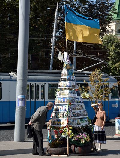 La frialdad del monumento oficial a los héroes de la operación antiterrorista contrasta con este lugar, donde familiares y amigos colocan flores y símbolos ucranianos junto a las fotografías de los héroes locales caídos en la guerra. Algunas de esas fotografías son recientes, de los últimos días, explica Serhiy, un soldado del ejército ucraniano que se acerca a responder las preguntas de los únicos extranjeros en el lugar.