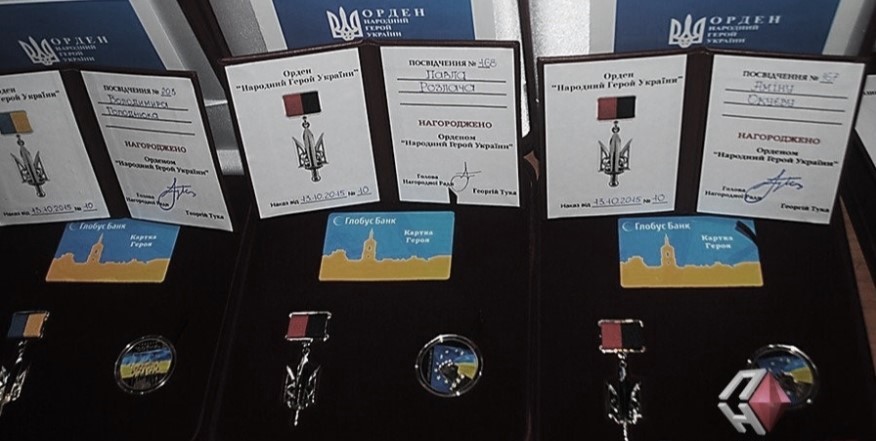 A la derecha, la medalla entregada a Amina Okueva como miembro de la Orden de los Nuevos Héroes de Ucrania. Tiene los colores rojo y negro de sus antecesores de la UPA.