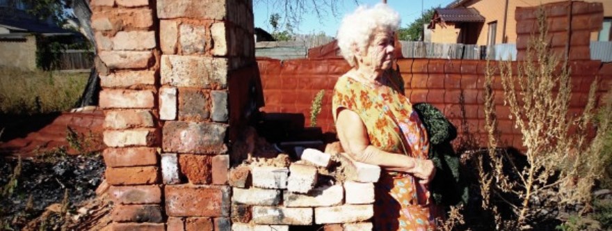 Natalia Nikolayevna, la ayudante del alcalde, tiene que irse a seguir trabajando. Llega con nosotros hasta la casa de Valentina Nikolayevna Murzak y después se excusa. Al principio no podemos encontrar a Valentina Nikolayevna, su casa está destruida. Vive con otra mujer mayor.