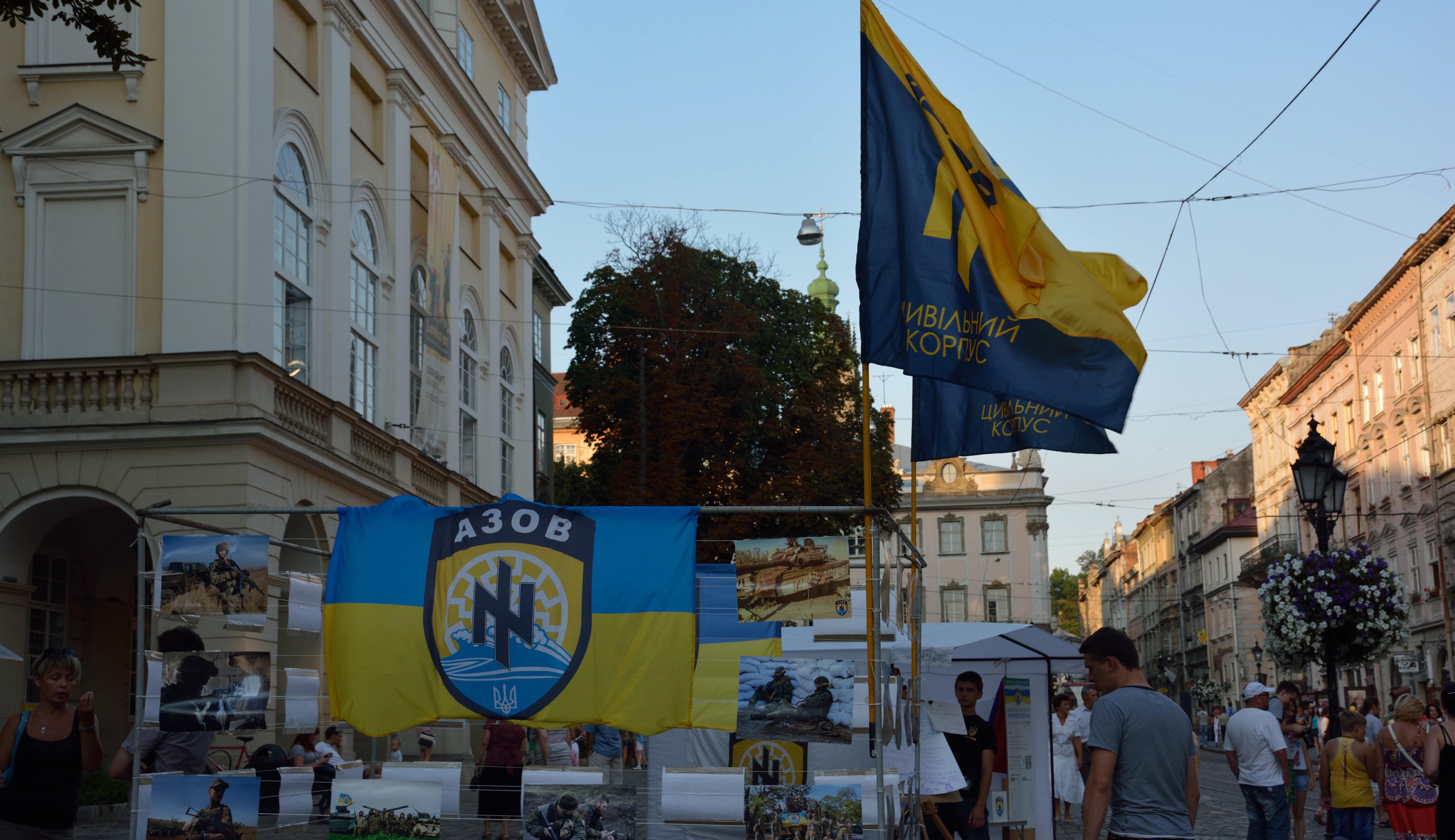 Stand del batallón Azov en el centro de Lviv. Al fondo, el edificio en el que Yaroslav Stetsko proclamó la independencia de Ucrania en 1941