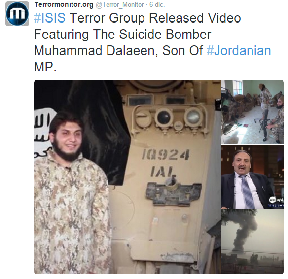 Un artículo publicado por distintos medios el día 13 de diciembre aborda el proceso de reclutamiento entre los jóvenes universitarios jordanos, afectados por el nepotismo político de Jordania y por las altas tasas de paro, un proceso que también se extiende a las mujeres. El artículo habla del caso de una joven estudiante reclutada por el ISIS en Ai, el lugar de nacimiento de Dalaeen. En él vuelve a aparecer el papel central de Turquía como localización de los centros de acogida de los nuevos reclutas antes de su paso hacia Siria. Poco importa que partan de Ucrania o de Jordania, todos pasan por el estado de Erdogan.