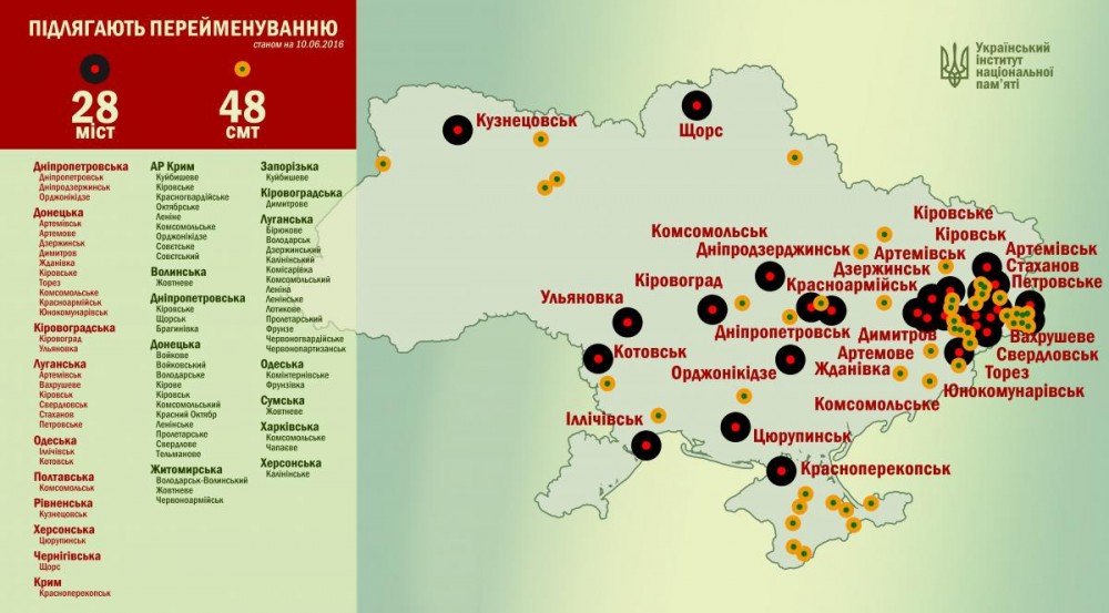 Según informaba esta semana RIA Novosti, el Instituto Ucraniano de la Memoria Nacional afirma que 943 localidades deben ser renombradas antes de noviembre. Todas ellas contienen referencias a personajes o hechos relacionados con la Unión Soviética especificados en una lista elaborada por ese Instituto. La lista contiene también los nombres de Kirov o Petrovsky, aunque los casos de Kirovograd y Dnipropetrovsk, que Ucrania admite que serán tratados aparte, se han complicado inesperadamente para Viatrovych.