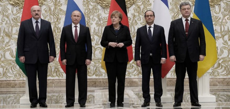 Alexaander Lukashenko, Vladimir Putin, Angela Merkel, François Hollande y Petro Poroshenko, que en una maratoniana reunión que se alargó toda la noche negociaron el acuerdo.