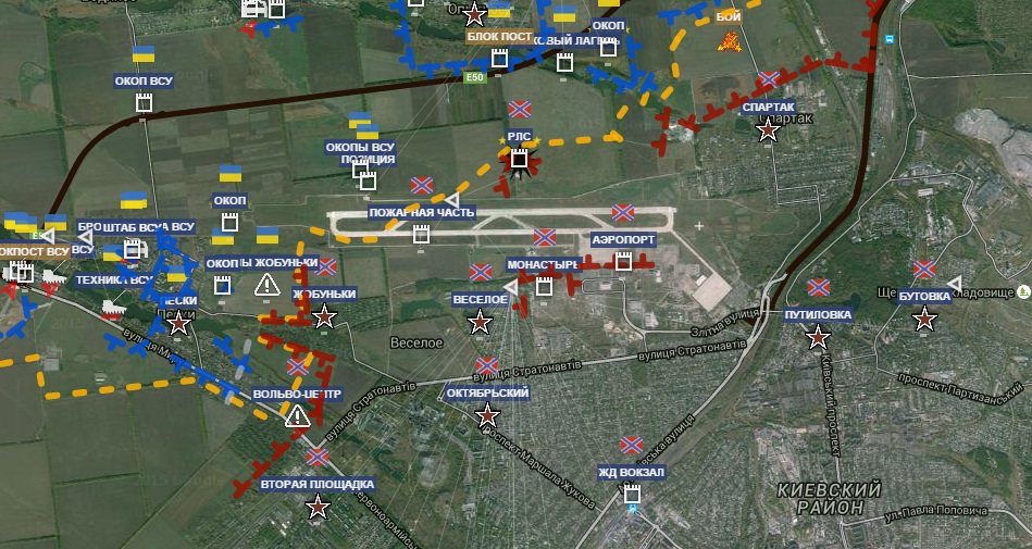 Posiciones ucranianas y de la RPD en la zona del oeste de Donetsk y alrededores del aeropuerto, donde siguen produciéndose ataques y bombardeos.