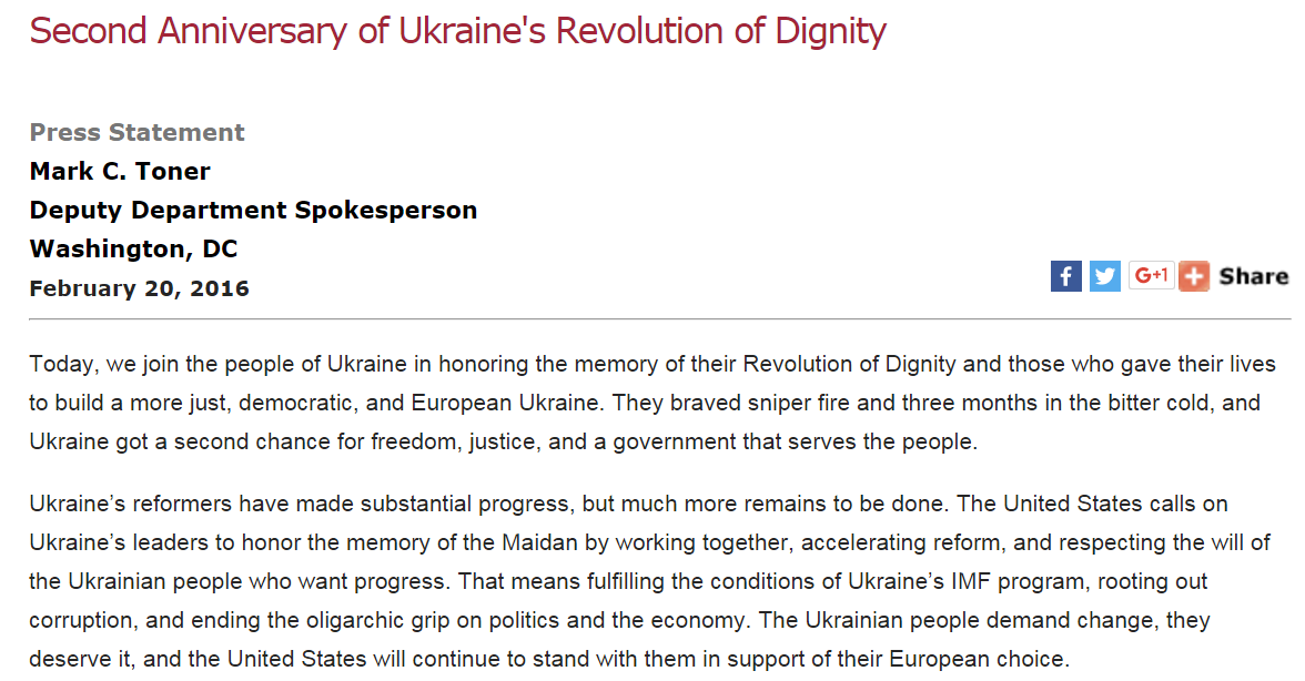 Y así llegó el comunicado del Departamento de Estado de Estados Unidos, que llamaba al Gobierno ucraniano a “la unidad por las reformas”. Los “verdaderos” patriotas respiraron aliviados. Estados Unidos no apoyaba el tercer Maidan, así que no hay ningún problema. Los intereses del pueblo ucraniano siguen bajo protección del Departamento de Estado. ¡Salvados!