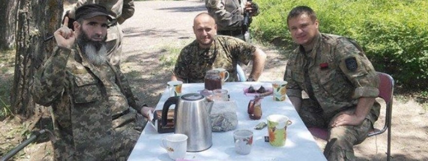 Cheberloevky, comandante del batalón Sheik Mansour, y Yarosh, terminando de comer en alguna zona en el frente de Shirokino