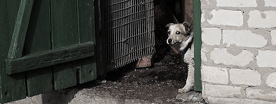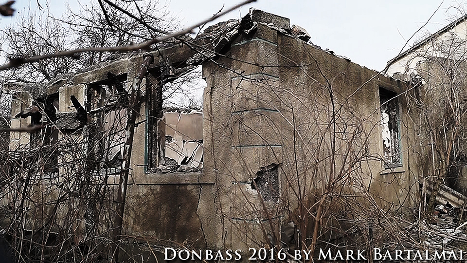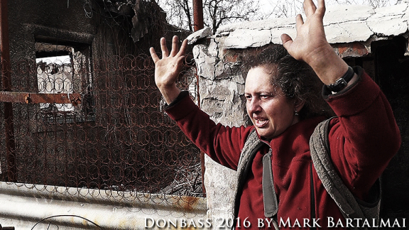 El lugar está lleno de metralla y la casa está poco más que en ruinas. El pequeño ladrador protege piedras muertas en dos sentidos. Los ataques de artillería han dejado su marca. Ya nadie puede vivir aquí. Y aun así, aquí hay más de treinta familias que aguantan en este lugar. La mayoría son demasiado mayores para poder huir. Pero esa no es la única razón. Algunos de ellos simplemente no quieren marcharse.