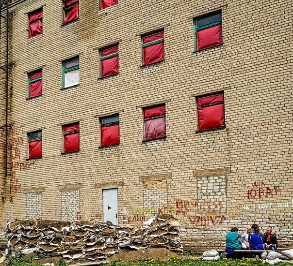 El vehículo se detuvo. Salimos y recogimos del maletero las cámaras y la protección. Lo primero que llamó mi atención fue un edificio destruido. Creí que estaba abandonado. Todas las ventanas estaban protegidas con madera y plástico. Un patio prácticamente vacío. Detrás del edificio había un campo de fútbol. Estaba cubierto de hierba alta descuidada. Era evidente que hace mucho tiempo que nadie juega allí. Justo a continuación del campo había una señal de advertencia: “Minas”. Para mí ese tipo de señales no son ni nuevas ni inusuales. Las he visto muchas veces en el frente. Un poco más lejos observé un edificio de apartamentos. En el balcón un hombre fumaba tranquilamente un cigarro. Muchas veces son los mayores los que siguen viviendo en la línea del frente, las personas que no tienen dónde ir. Esperaba eso, pero no esperaba escuchar la sirena del colegio. No podía creerlo cuando se abrió la puerta y comenzó a salir corriendo un grupo de niños de diferentes edades.