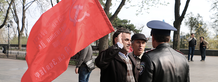 Policía de Odessa exige a los miembros del partido comunista que retiren las banderas soviéticas. Abrill de 2015.