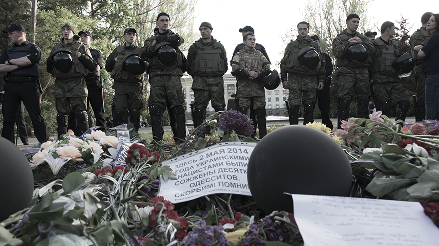 Con toda la atención puesta en Kulikovo, las autoridades locales no pudieron impedir que, a primera hora de la mañana del 2 de mayo, activistas de grupos juveniles de la ciudad desplegaran una pancarta de varios metros de longitud que cubría un tramo de las escaleras de Odessa. “Poroshenko tapa a los asesinos”, podía leerse en la pancarta bajo una enorme fotografía del presidente ucraniano.