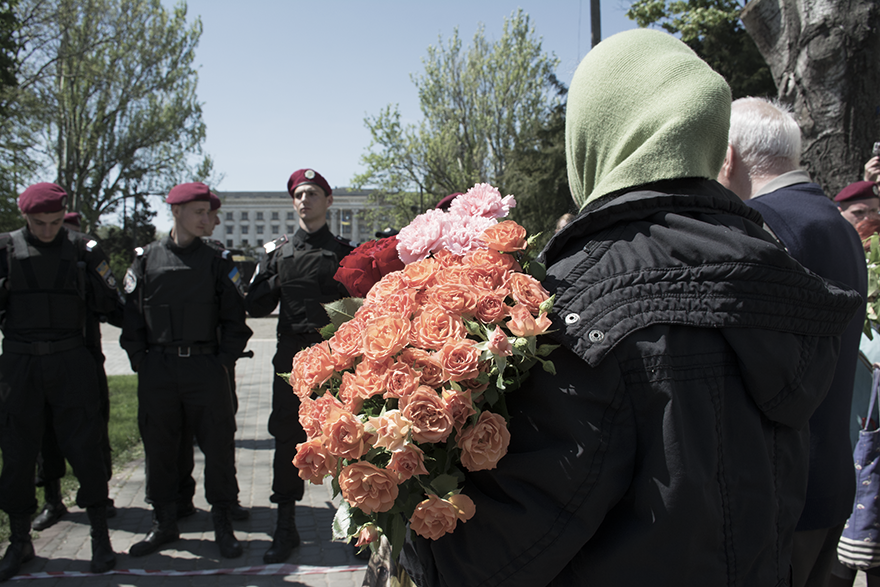 Ante la pregunta de cuándo se iba a abrir el acceso, si es que iba a abrirse, uno de los observadores de la OSCE afirmó no tener información al respecto. “Es cosa de ellos”, afirmó señalando a la policía. “Hay que tener paciencia”. En ese momento hacía ya cuatro horas que ciudadanos de Odessa habían comenzado a acercarse a Kulikovo portando flores, que fueron depositadas en un campo directamente enfrente de la Casa de los Sindicatos, a unos metros del cordón policial. Los observadores de la OSCE tampoco tuvieron respuesta para la queja de un grupo de mujeres que exigían a la organización que informaba de la presencia de francotiradores –o soldados, desde esa posición era imposible comprobar si estaban armados, aunque el hecho de que las tropas del SBU no fueran vistas en todo el día hace pensar que podrían ser ellos quienes ocuparan esas posiciones- en los tejados de la Casa de los Sindicatos y un hotel cercano.