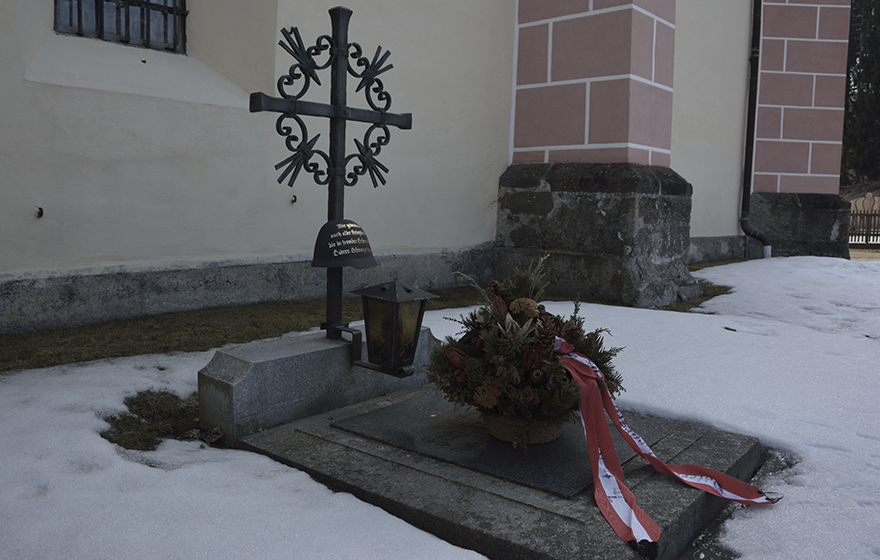 El tiesto de flores secas colocado sobre la lápida por la Österreicher Schrwarzer Kreuz ocultaba el nombre de Fritz Freitag. En una cinta con los colores de la bandera austriaca se podía leer: Im Treuer Gedenken.