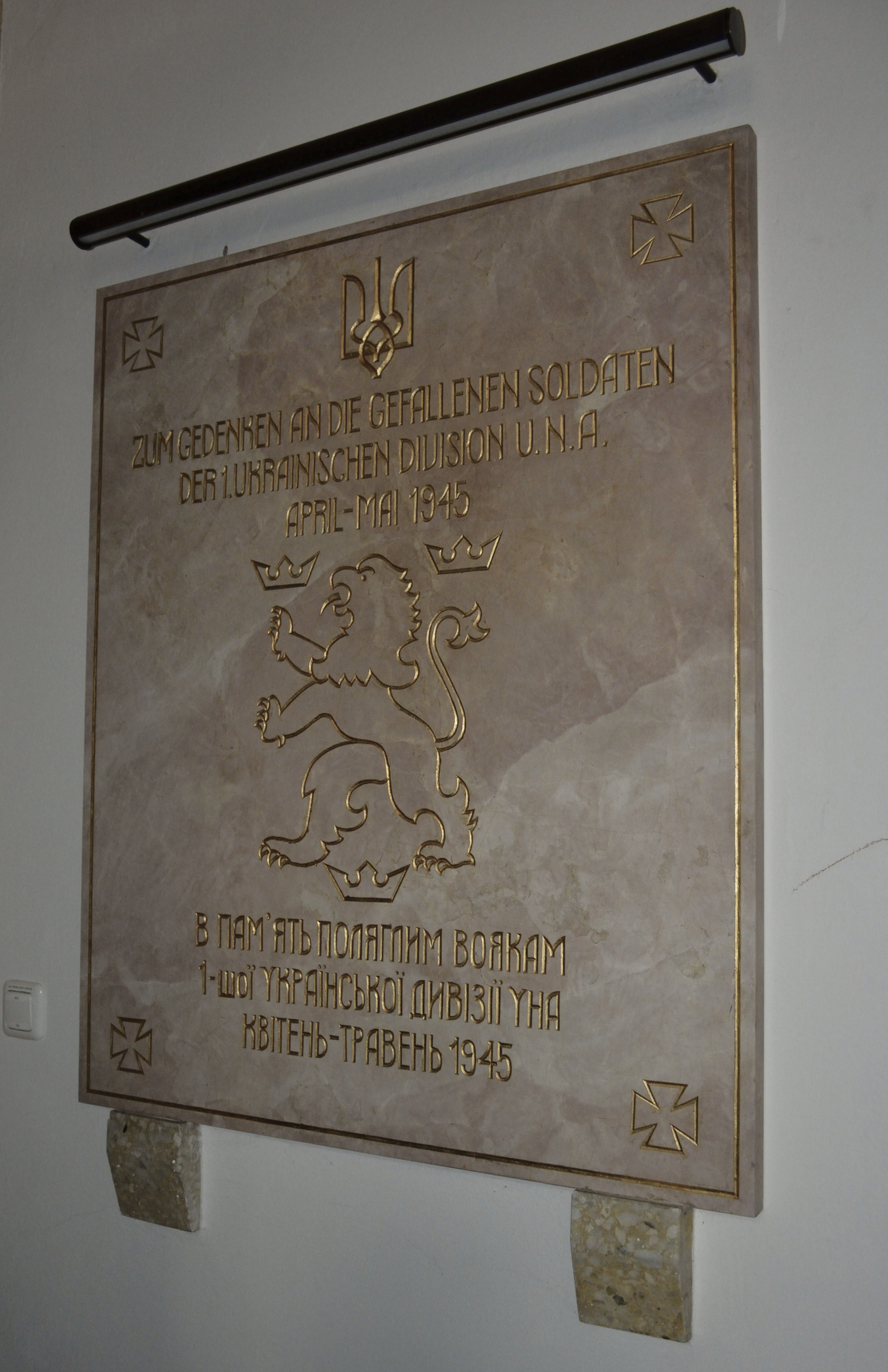 Algo similar ocurre con la capilla anexa a la iglesia principal por la que se accede a esta en la actualidad. En esa capilla están recogidos en distintas placas monumentales los nombres de muertos de las dos guerras mundiales (Heldengedächtnisstätte). En la esquina a la izquierda de la puerta de entrada, la más monumental de las placas presentes en la capilla es el emblema de la División Galizia y del Ejército Nacional Ucraniano, el león que también representa a la zona de Lviv.