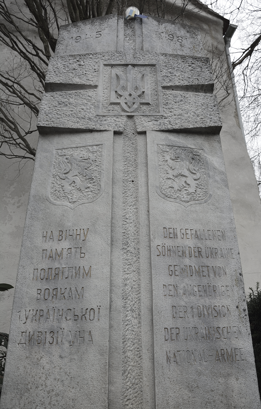 A diferencia de la descuidada y esquinada placa que recuerda a los “rusos” (ni siquiera algo menos genérico como soldados rusos) en el Soldatenfriedhof de Mühldorf, los tres monumentos dedicados al Ejército Nacional Ucraniano están perfectamente mantenidos. En particular, las letras doradas del que puede verse en la iglesia parroquial de Feldbach se mantienen en perfecto estado tras su última restauración. Todos los monumentos esconden que la división actuó como unidad de las Waffen SS, escudándose convenientemente en una denominación, la de Ejército Nacional Ucraniano, bajo la que la unidad solo operó en las últimas dos semanas de guerra. Todos ellos utilizan además la enseña original de esta unidad de las SS, algo que, en teoría, es ilegal en Austria.