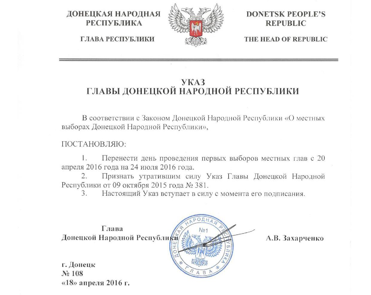 Decreto por el que la RPD convocaba elecciones para el 24 de julio, pospuestas una vez más ante la falta de acuerdo con Ucrania.