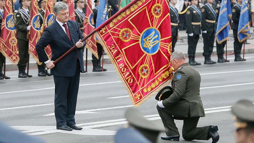 Con frenesí patriótico: El Presidente Poroshenko presenta la «Bandera de honor» a un mando militar (Kiev, 24 de agosto).