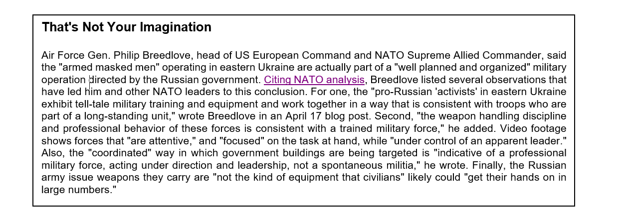 Confirmando esa predisposición, el 26 de abril, en un correo a Natalie Crawford, Breedlove acompaña un texto, That’s Not Your Imagination, en el que señala que “los hombres armados enmascarados” operando en el este de Ucrania son en realidad parte de una operación militar “bien planificada y organizada”, dirigida por el gobierno ruso. Sus conclusiones se basan en un análisis de la OTAN que revelaría que los insurgentes no son parte de una milicia espontánea.