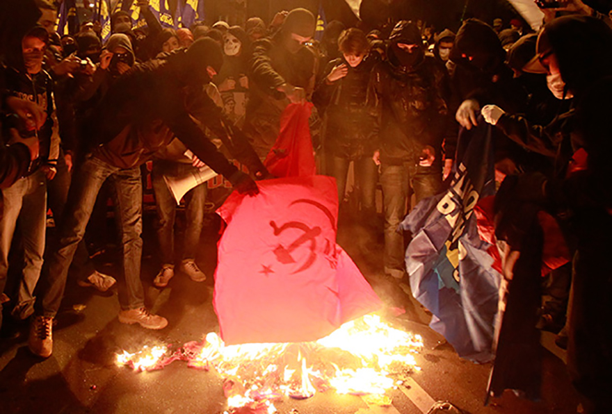 Lo ocurrido el 14 de octubre de 2013 fue un anticipo de lo que iba a ocurrir posteriormente en Ucrania. Los nacionalistas reunieron en Kiev a 15-20.000 de sus seguidores y, aunque no se produjeron enfrentamientos directos con los antifascistas, se quemaron banderas del Partido de las Regiones y del Partido Comunista.