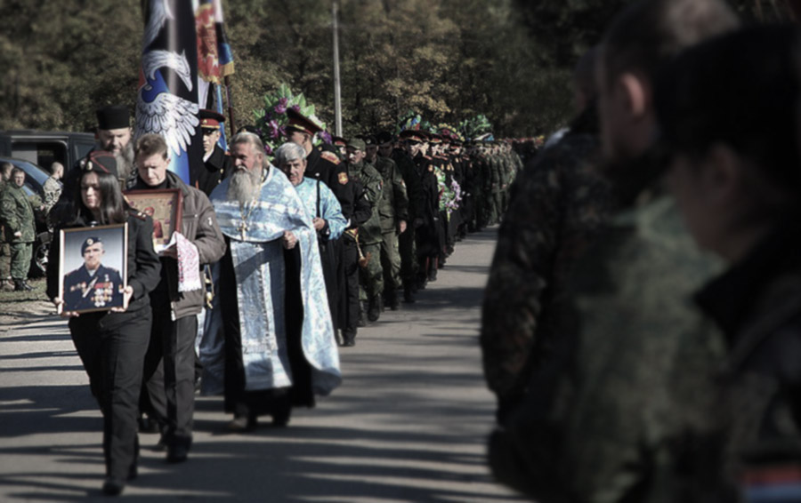 Solo los compañeros y amigos más cercanos acudieron al cementerio. El cortejo fúnebre se aproximó poco a poco al lugar de la tumba. En un cojín rojo iban, iluminadas por el sol, las medallas de Arsen. Daniel, el hijo de 9 años de Arsen, portaba la estrella más importante: la de héroe de la RPD. En sus mejillas caían grandes lágrimas. Su padre le había visitado en Rusia e incluso planeaba traérselo. Pero tras un atentado cambió de opinión y decidió no arriesgar.