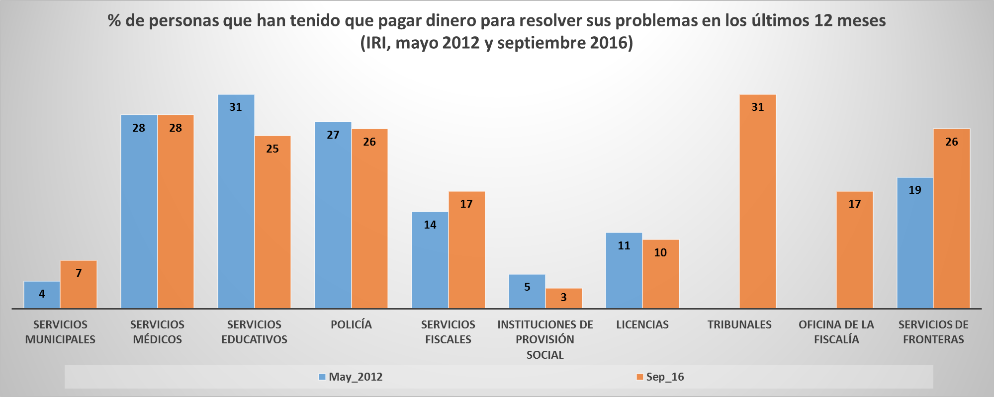 Aunque no hay datos históricos para poder comparar, otro ámbito en el que se observa un deterioro relacionado con la corrupción, claramente señalado por la población, es el vinculado a la oficina de la fiscalía y, de forma aún más intensa, a la actuación de los tribunales. En esta última dimensión, y en las personas que se han enfrentado a problemas en este ámbito de las relaciones con el Estado, un 31% de las personas señalan en 2016 haber tenido que pagar dinero para resolver sus problemas con la justicia.