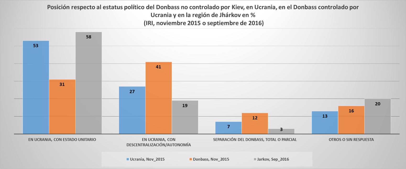 En lo relativo al futuro estatus del Donbass, en el conjunto de Ucrania, un 53% de la población apostaba en noviembre de 2015 por el Estado unitario frente a un 27% que apoyaba la descentralización o la autonomía y un 7% la separación de los territorios de Donetsk y Lugansk. En el Donbass controlado por Kiev, la apuesta por el Estado unitario ucraniano se reducía al 31%, por debajo del 41% que apoyaba la descentralización o la autonomía, con otro 12% a favor de la independencia. En la región de Járkov, en cambio, un 58% de la población señala apostar en septiembre de 2016 por el Estado unitario frente a un 22% de apoyos a la descentralización, la autonomía o la independencia.