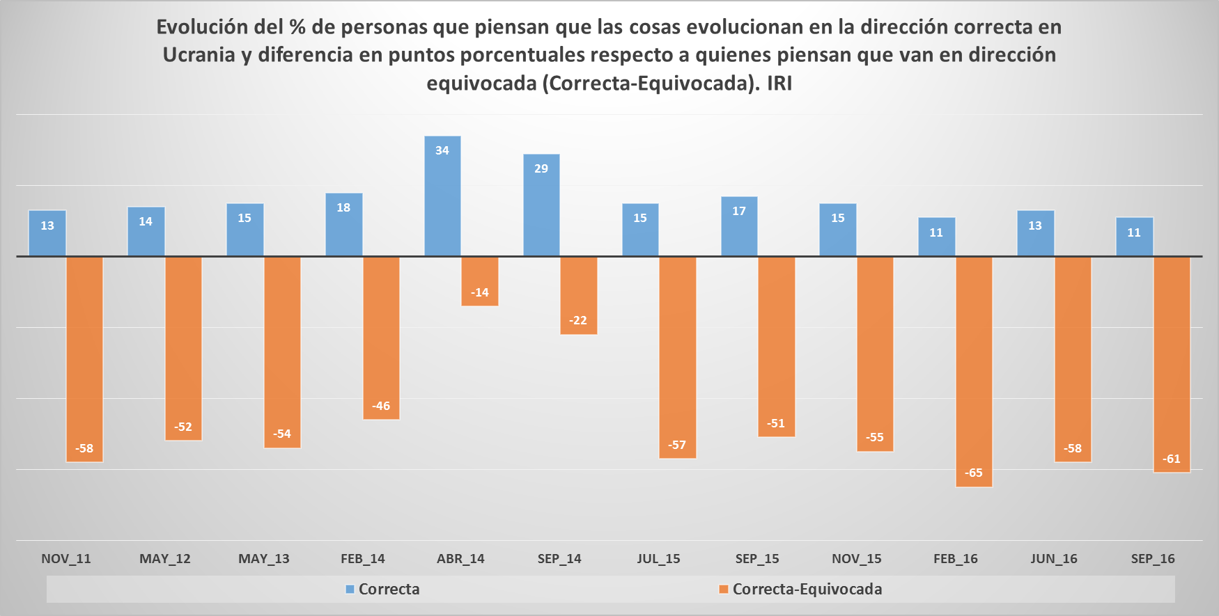 La comparación de la diferencia entre opiniones positivas y negativas, respecto al rumbo correcto o equivocado del país, muestra las mismas tendencias. En 2016, la orientación a las respuestas desfavorables alcanza máximos desde 2011, cercanos o superiores a -60 puntos negativos en septiembre de 2016. Se trata de niveles sólo comparables a los -58 puntos negativos de noviembre de 2011. Durante el periodo Yanukovich, estos niveles se redujeron a -52/-54 puntos en 2012 y 2013 y a -46 en febrero de 2014. Tras caer a -14 y -22 puntos en abril y septiembre de ese año, la esperanza Maidan pronto se desvanece. A lo largo de 2015 se vuelve a niveles de insatisfacción política que resultan similares a los de 2012 y 2013, antes de alcanzarse los peores niveles de la década en 2016.