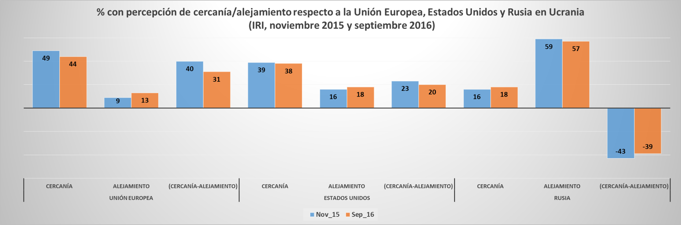 La valoración negativa caracteriza en cualquier caso al vecino ruso. En la Ucrania de finales de 2016, un 57% de la población se muestra alejada de Rusia frente a apenas un 18% que la considera cercana (59 y 16% en noviembre de 2015). Aunque se reduce a -39 puntos desde los -43 de noviembre de 2015, en lo que respecta a Rusia, el porcentaje de cercanía es notablemente inferior al de alejamiento.