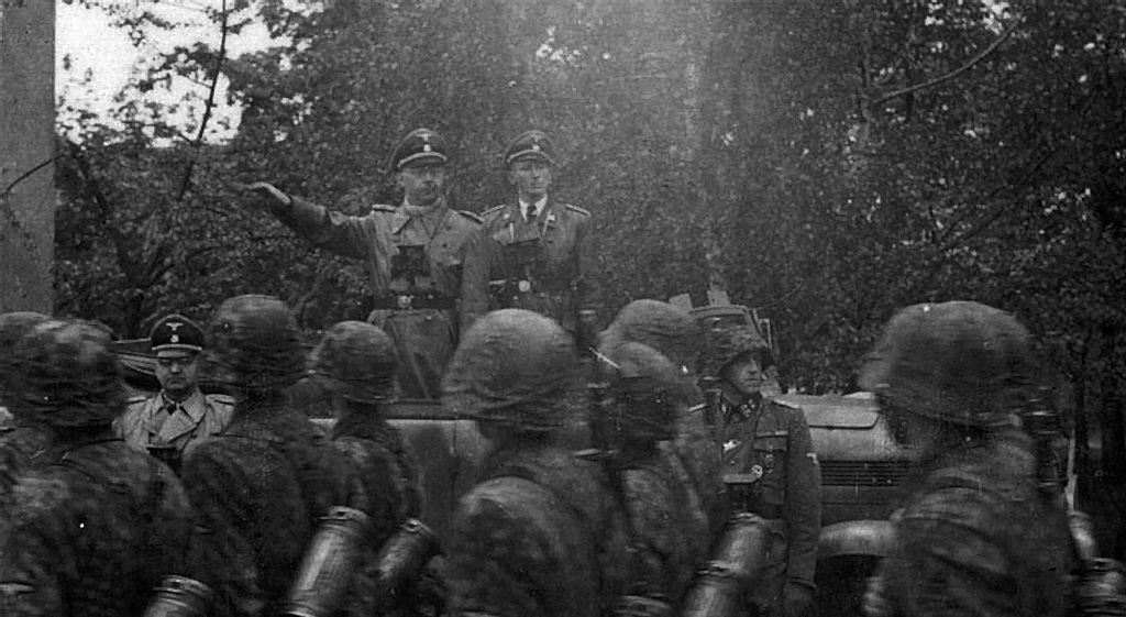 Miembros de la SS-Freiwilligen-Division “Galizien” marchan frente a Fritz Freitag, Heinrich Himmler y Otto Wachter
