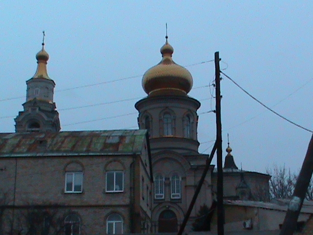 Lena me lleva a la iglesia de Pokrovsky y cuenta que en agosto de 2014, el templo sufrió daños a causa de una explosión cercana de un proyectil ucraniano. La metralla dañó las paredes y también resultó afectada la cúpula.