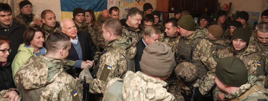 El proyecto McCain-Graham no es de autodefensa sino de ofensiva. Junto a la demócrata Amy Klobuchar, Lindsey Graham y McCain estuvieron, el día de Nochevieja, en Shirokino junto a los componentes de una Brigada de marines ucranianos. Con traje de faena, Petro Poroshenko completaba la siniestra escena. Ahí Graham afirmó: “Vuestra batalla es nuestra batalla” y “2017 será el año de la ofensiva”. «Todos nosotros regresaremos a Washington y empujaremos el caso contra Rusia. Basta de una agresión rusa. Es hora de que paguen un precio más alto. Nuestra lucha no es con el pueblo ruso, sino con Putin. Nuestra promesa a ustedes es llevar su causa a Washington, informar al pueblo estadounidense de su valentía y hacer llegar el caso contra Putin al mundo «. Interviniendo a continuación, McCain sentenció: “Creo que vencerán. Estoy convencido de que vencerán y haremos todo lo que podamos para ofrecerles lo que necesitan para ganar”. En otras palabras: más armas y más peligrosas.