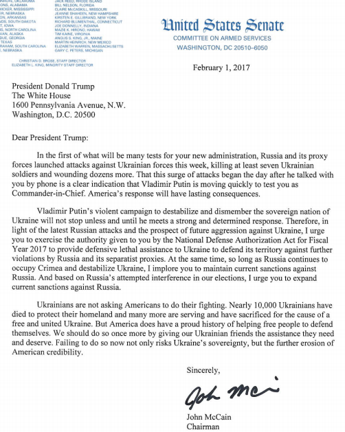 El 1 de febrero, actuando como Presidente del Comité de Servicios Armados del Senado, McCain remitió una ilustrativa carta al Presidente Trump en la que pedía el endurecimiento de la política estadounidense contra Rusia.